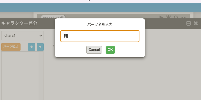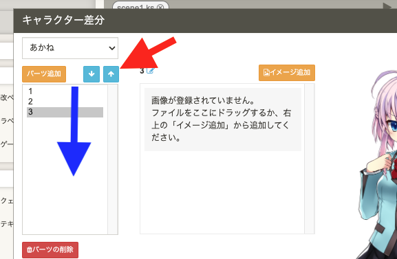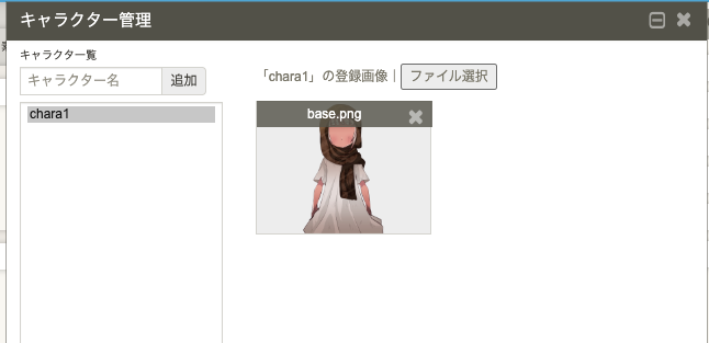 つまり、差分として使用する場合、一番うしろに配置してほしい画像をキャラクター登録で配置します。