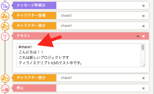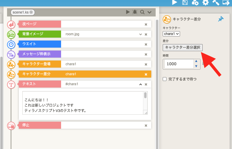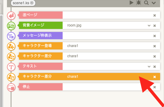 順番は「キャラクター登場」が先で次に「キャラクター差分」となるように配置してください。
