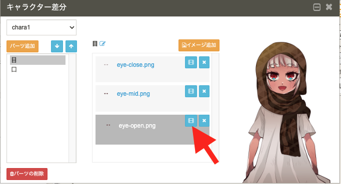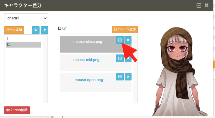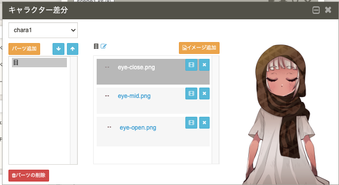 このように、新しくキャラクター差分を差し込みます。こんどは目と口を閉じた状態で登録します。