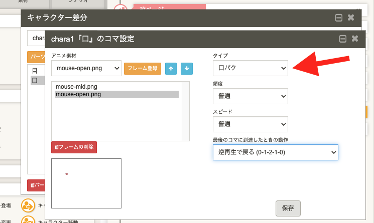 閉じている状態の次は、mouse-mid.png → mouse-open.png の順番になるので、そのようにフレーム登録します。