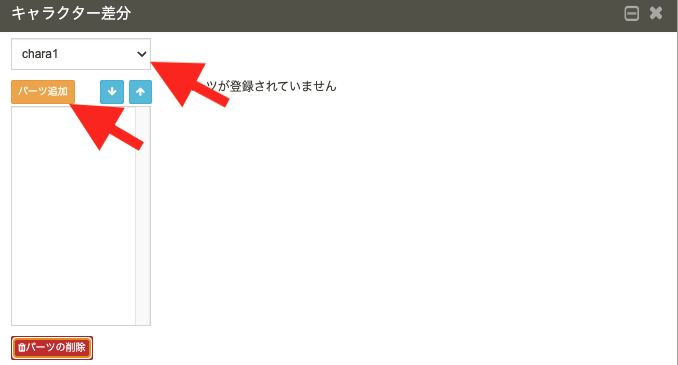 先程登録した「chara1」が選択できる状態になっていますので選択します。続けて「パーツ登録」をクリックして