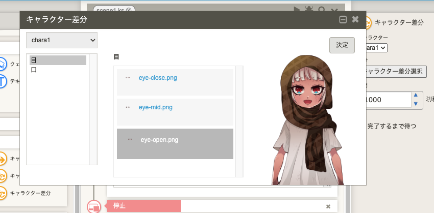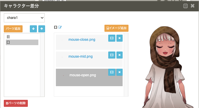キャラクター差分機能をつかうと、簡単に目パチと口パクを実装することができます。