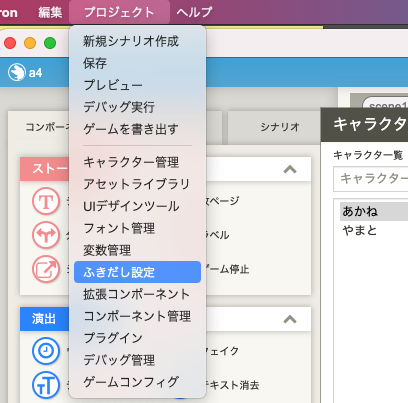 続いて、ふきだし設定画面を開きます。画面上部のプロジェクト-ふきだし設定をクリック