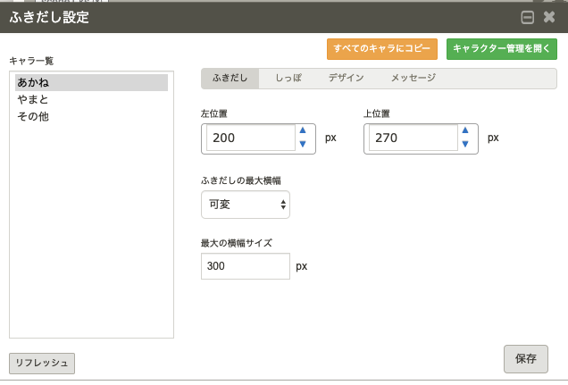 ふきだし設定はキャラクターごとに表示方法を細かく設定することができます。