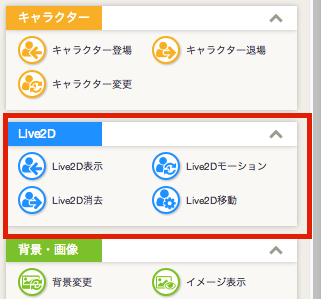 その他にも、キャラクターを退場させるときは「Live2D消去」位置を移動させるときは「Live2D移動」コンポーネントが便利です。