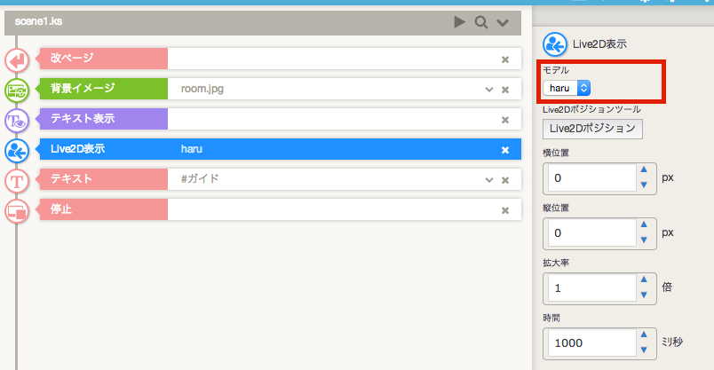 左エリアから「Live2D表示」をドラッグ&ドロップで追加します