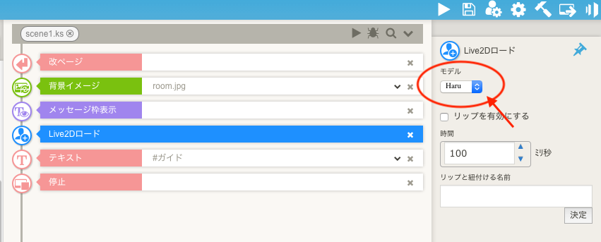 ちなみに「Live2Dロード」はモデルをゲームに表示させるための準備を行います。「Live2D表示」で実際に画面に表示されます。