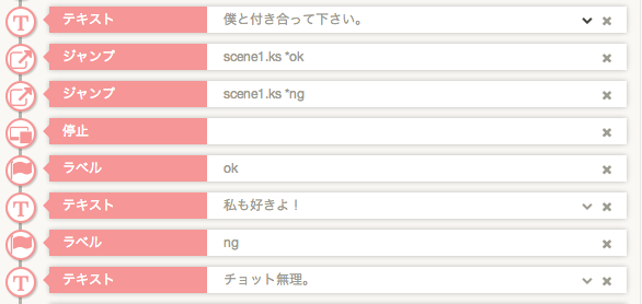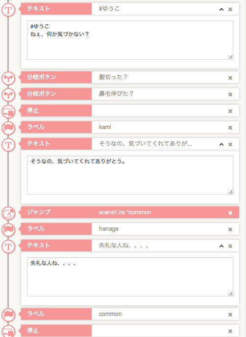 まずは、「好感度を上げる」処理なのでラベル「kami」のすぐ後ろに配置しましょう。