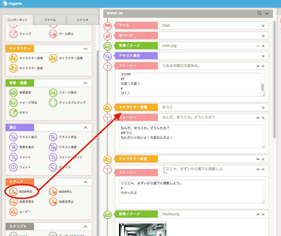 BGMを再生するタイミングですが、今回はゆうこが登場したところで再生するようにしてみましょう。